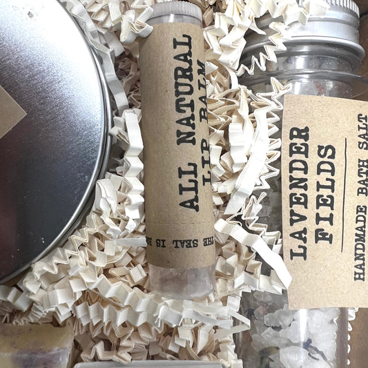 Lavender Fields Box Gift Set Soap, soy Wax Candle, Matches Lip balm, Handmade Bath salt
